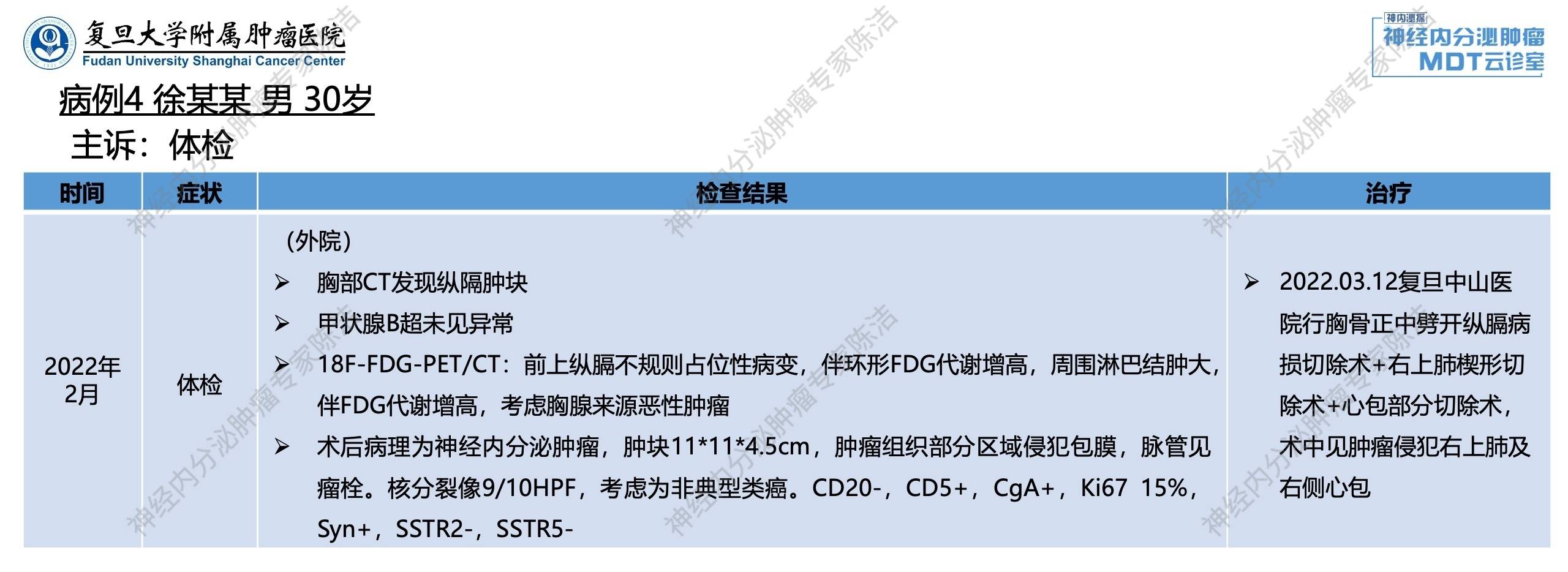 病理科黄丹教授:该患者前纵隔肿瘤特点是存在脉管内瘤栓和侵犯包膜,具有不良生物学特征。Ki67 15%,在肺纵隔NET里属于偏高。与消化系统NET不同,纵膈来源NET较大比例情况下不表达生长抑素受体,仅表达神经内分泌标记物。