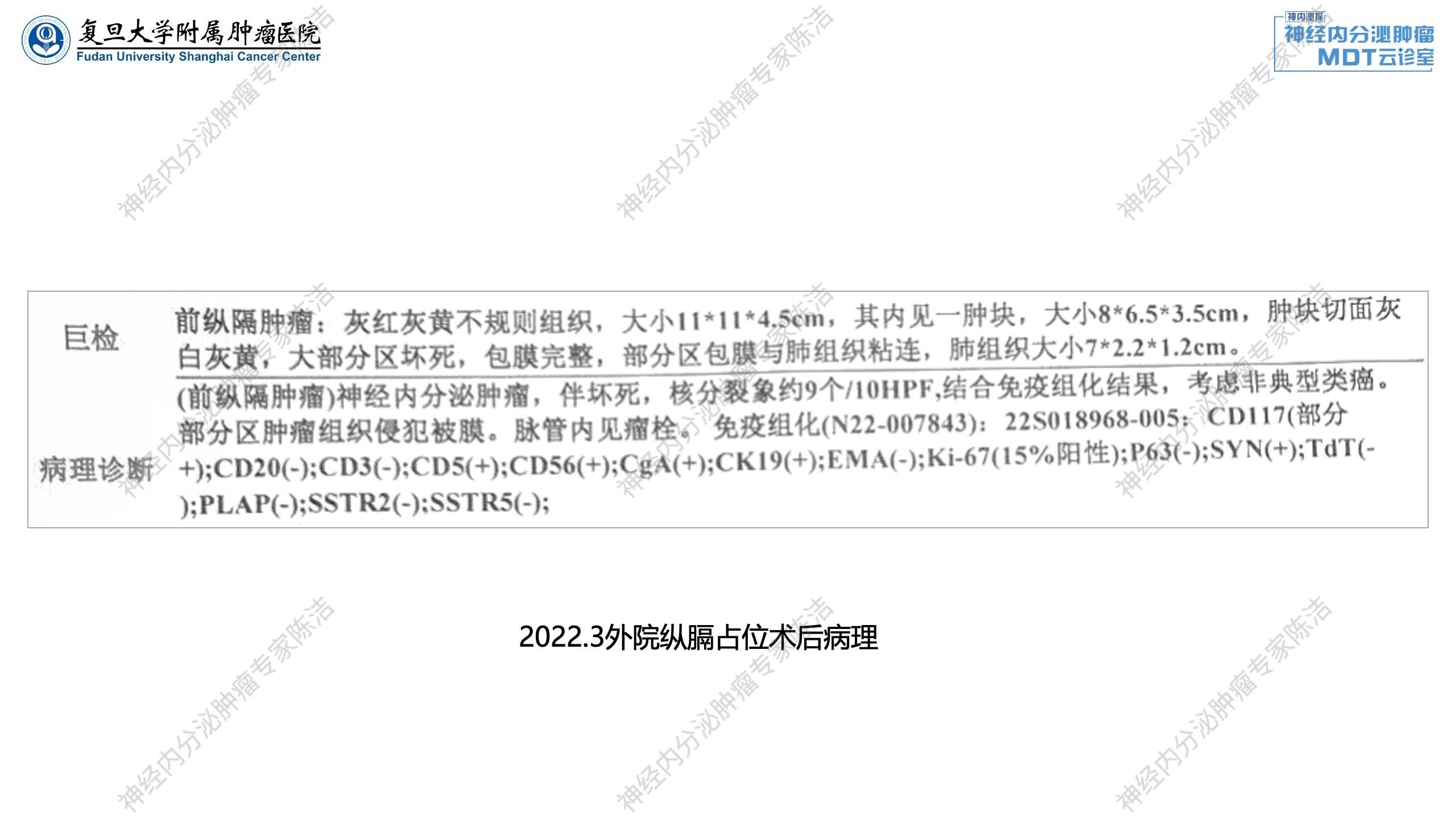 患者于2022年3月12日行胸骨正中劈开纵隔病损切除术+右上肺楔形切除术+心包部分切除术,术中见肿瘤侵犯右上肺及右侧心包。术后病理提示神经内分泌肿瘤,肿块11*11*4.5cm,肿瘤组织部分区域侵犯包膜,脉管见瘤栓。核分裂象9/10HPF,考虑为非典型类癌。