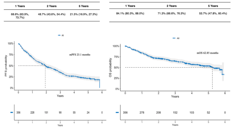 经过中位近4年的随访,研究取得了多项关键发现。在整体疗效方面,356例患者的ORR达83%,其中CR率为35%,中位PFS为23.1个月,mOS长达62.85个月,显著优于ASPIRE试验中48.3个月的OS数据。