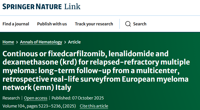 Conticello C, Del Fabro V, Romano A, et al. Continous or fixedcarfilzomib, lenalidomide and dexamethasone (krd) for relapsed-refractory multiple myeloma: long-term follow-up from a multicenter, retrospective real-life surveyfrom European myeloma network (emn) Italy[J]. Annals of Hematology, 2025, 104(10): 5223-5236.