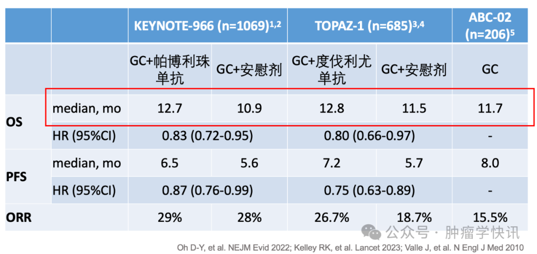 尽管在化疗基础上增加免疫治疗可以延长患者生存,但中位 OS 的延长不足 2 个月,患者的中位生存期还停留在 1 年左右的水平,这表明大部分患者的获益不多。虽然化疗联合免疫治疗让少数患者获得了长期生存的机会,但 TOPAZ-1 和 KEYNOTE-966 研究的长期随访中, 接受化疗+免疫治疗的患者,3 年生存率依然约为 15%,这个数据仍然远低于预期。回顾 2010 年报道的 ABC-02 研究,接受 GC 化疗的患者 mOS 11.7 月,到现在联合免疫治疗,mOS 也不足 13 月。由此可见,这十多年来,不可切除 BTC 的生存时间延长幅度实在是太小了。