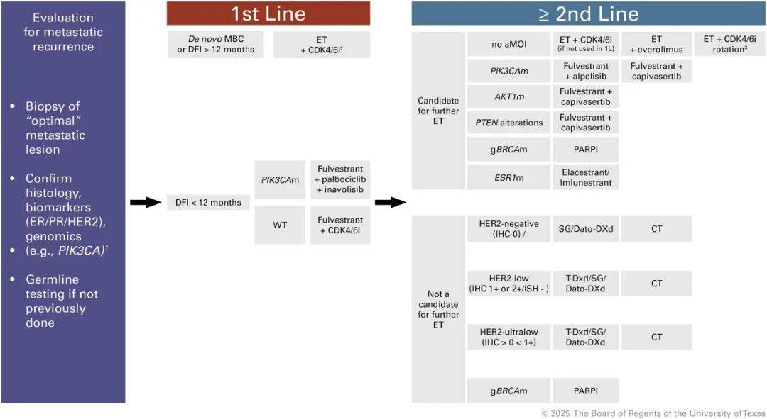 无明确靶点 :对于不伴上述可治疗突变的患者,可选择 氟维司群 联合mTOR抑制剂 依维莫司 ,或根据情况选用其他抗体缀合药物(如 戈沙妥珠单抗、 德达博妥单抗 )或单药化疗。