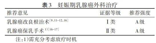 乳腺癌改良根治术是PrBC病人的标准手术方式[9,11-12,16]。1期和Ⅱ期PrBC病人保乳手术与乳腺切除术的术后生存率相似[16-17]。基于放射治疗对胎儿有明确的致畸等损伤风险[8,12],专家组建议选择保乳手术前需充分考虑术后放射治疗时机。腋窝前哨淋巴结活检示踪剂99mTc标记的硫胶体对发育中的胎儿相对安全,但提供安全性数据的研究证据级别不高[3,7,11]。异硫蓝及亚甲蓝等染料示踪剂可能引起母体的过敏反应,其安全性在妊娠期女性中尚未明确[3,7,11-12]。2025版《NCCN乳腺癌临床实践指南》指出,妊娠<30周的乳腺癌病人不应进行腋窝前哨淋巴结活检[11]。由于妊娠期乳房外形的改变以及麻醉手术时间的增加等情况,专家组不推荐针对PrBC病人实施一期乳房重建。PrBC外科治疗及推荐强度见表3。