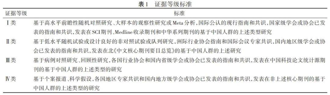 本指南文献证据等级参考GRADE系统,见表1。对Ⅰ类、Ⅱ类证据等级的意见进行投票表决,取得≥90%专家组成员一致意见作为A级(强推荐),≥80%,<90%的意见作为B级(弱推荐),<80%的意见作为C级(不推荐)。