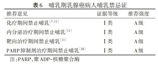 PPBC的手术治疗原则可参考常规乳腺癌病人的手术原则执行。但临床医师需注意,哺乳期乳房的生理性改变可能影响术后形态,故在选择保乳手术及一期重建手术时应持谨慎态度。目前无明确证据表明哺乳期进行乳腺手术必须终止哺乳,病人可于术前排空乳汁,术后用健侧乳房继续哺乳[35]。多柔比星(阿霉素)、紫杉烷类、铂类、环磷酰胺等化疗药物均可进入母乳,故化疗期间应禁止哺乳[7,11]。此外,在内分泌治疗期间、抗HER-2靶向治疗期间、靶向治疗结束后6个月内、PARP抑制剂治疗期间以及PARP抑制剂治疗结束后1个月内,均应禁止哺乳[11,28-29]。放射治疗可能引起乳汁质量下降、乳头皮肤皲裂、难治性乳腺炎等并发症,进而导致哺乳困难[7,9,11],因此,放射治疗期间不建议哺乳。PPBC治疗期间的哺乳禁忌及推荐强度见表6。