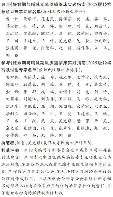 妊娠期乳腺癌(breast cancer in pregnancy,PrBC)和哺乳期乳腺癌(postpartum breast cancer,PPBC)发生于女性特殊生理时期,其诊疗过程需兼顾母亲疗效和子代安全,是临床处理的难点。随着我国女性生育年龄的增长和生育政策的改变,PrBC和PPBC受到越来越多关注。研究结果表明,妊娠中期确诊乳腺癌的病人预后较差,可能与妊娠期进行乳腺癌诊治较为困难有关[1]。为规范PrBC和PPBC临床诊治流程,中华医学会外科学分会乳腺外科学组组织国内部分专家在《中国妊娠期与哺乳期乳腺癌临床实践指南(2022版)》的基础上[2],参照推荐意见分级的评估、制定与评价(grading of recommendations assessment,development and evaluation,GRADE)系统对新增推荐意见的临床研究证据质量进行评价,并结合我国病人临床特点以及我国乳腺外科临床实践的可及性,对该指南进行部分修订,旨在为国内乳腺外科医师临床工作提供参考。