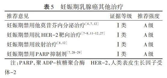 研究结果表明,他莫昔芬易导致胎儿畸形、阴道出血和流产[4,7,12]。胎盘组织及胎儿肾组织中均有人类表皮生长因子受体-2(human epidermal growth factor receptor-2,HER-2)表达,曲妥珠单抗对胎儿肾细胞的毒性作用可导致羊水过少,故应在产后给药[7-8,11-12,27]。妊娠期间进行放射治疗可能增加胎儿宫内生长受限、精神发育迟滞、胎儿患癌等风险,甚至导致胎儿死亡[8,12]。PARP抑制剂已被证明对胎儿具有致畸性和毒性[7,28-29]。应尽量避免在妊娠期间使用ICIs,以防新生儿出现罕见的免疫相关不良事件[30]。因此,PrBC病人在妊娠期间禁用他莫昔芬内分泌治疗、抗HER-2靶向治疗、放射治疗和PARP抑制剂治疗,并应避免使用ICIs。PrBC其他治疗及推荐强度见表5。