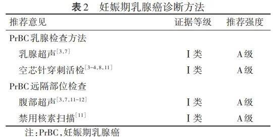 针对乳腺影像报告与数据系统(breast imaging reporting and data system,BI-RADS)4类、5类以及BI-RADS 3类伴有危险因素的病人,选择空芯针穿刺活检(core needle biopsy,CNB)进行组织病理学评价已获得广泛共识[3-4,8,11]。专家组推荐妊娠期女性在无禁忌证的情况下接受CNB检查,以获得病理组织学诊断。PrBC诊断方法及推荐强度见表2。