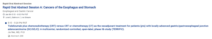 研究标题: 替雷利珠单抗联合放化疗(CRT)对比单纯放化疗(CRT)或化疗(CT)作为局部晚期胃/胃食管结合部腺癌(GC/GEJC)新辅助治疗方案:一项多中心、随机对照、开放标签Ⅱb期研究(TERRIFIC)