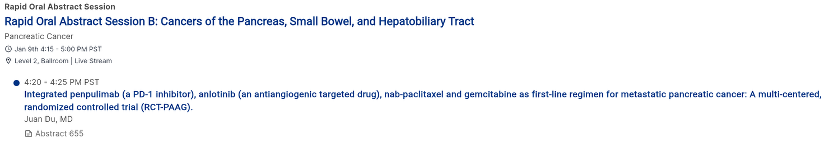 研究标题: 派安普利单抗(PD-1抑制剂)、安罗替尼(抗血管生成靶向药物)联合白蛋白结合型紫杉醇与吉西他滨联合方案一线治疗转移性胰腺癌:一项多中心、随机对照试验(RCT-PAAG)