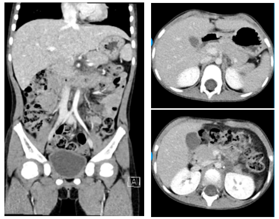 现病史:2023年11月29日患儿无明显诱因出现发热、腹痛。当地医院CT示:左上腹膜后腹主动脉左旁一巨大肿块影(约7.2 cm×5.3 cm×8.3 cm),腹主动脉左旁及左肾上腺多个结节状软组织影,考虑神经母细胞瘤。2023年12月29日在外院行腹膜后肿物穿刺活检术,病理倾向:节细胞神经母细胞瘤。复查CT示左侧腹膜后肿块伴多发钙化,腹膜后、膈肌脚后方多发淋巴结转移,左侧髂血管旁淋巴结肿大,未除外转移。NSE: 117 ng/ml。胸骨及髂骨骨穿均见到肿瘤转移。外院骨扫描(ECT)阴性,颅脑MRI未见肿瘤转移。临床诊断:左腹膜后节细胞神经母细胞瘤(M期,高危组),MYCN(-)。2024-1-6、2024-1-27行CAV/VIP方案化疗2程,化疗后左侧腹膜后肿瘤稍缩小,评估为疾病稳定(SD);复查胸骨骨髓涂片未见肿瘤,评估为完全缓解(CR)。2024-2-18转我院继续治疗。