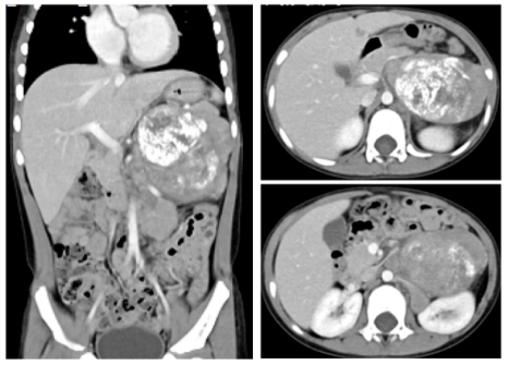 左上腹膜后腹主动脉左旁一巨大肿块影,约7.2 ×5.3 ×8.3 cm,腹主动脉左旁及左肾上腺多个结节状软组织影,考虑神经母细胞瘤(图1)。