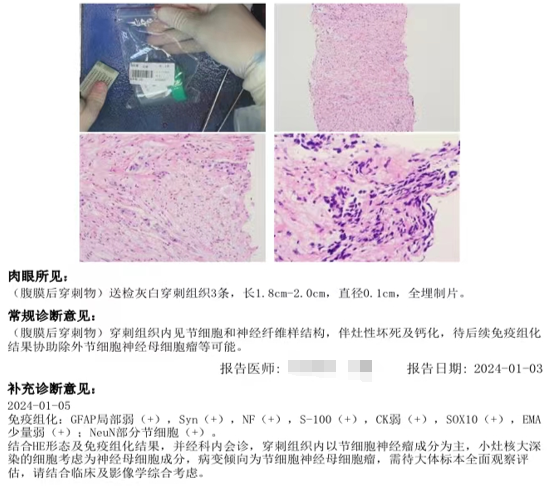 (腹膜后穿刺物)病变倾向节细胞神经母细胞瘤,需待大体标本全面观察评估,请结合临床及影像学综合考虑(图2)。