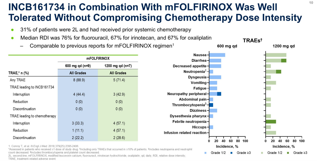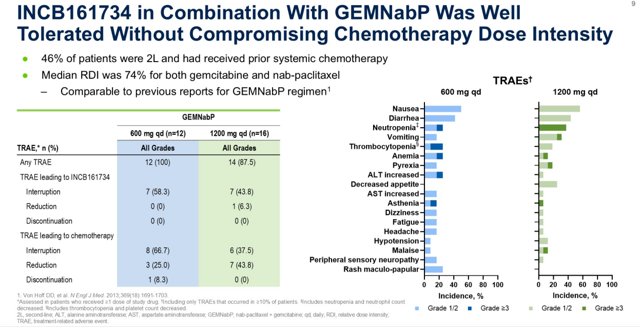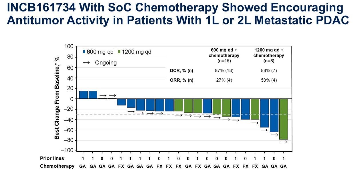 在重度经治的PDAC患者中,INCB161734展现了令人鼓舞的抗肿瘤活性。接受1200 mg qd单药治疗的41名可评价患者中,疾病控制率(DCR)达到78%,客观缓解率(ORR)为37%。在联合化疗组中,600 mg和1200 mg剂量下的DCR分别达到了87%和88%,ORR在1200 mg联合组中更是高达50%。