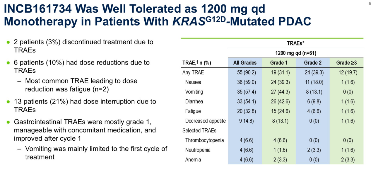 研究结果显示,INCB161734在1200 mg qd的推荐剂量下具有良好的安全性和耐受性。在单药治疗组中,最常见的所有等级治疗相关不良事件(TRAE)包括恶心(59.0%)、呕吐(57.4%)、腹泻(54.1%)和疲劳(32.8%),其中大部分胃肠道反应为1级,通过对症药物即可缓解,且呕吐主要局限于首个治疗周期。有3%的单药组患者因TRAE导致停药。在联合化疗方面,INCB161734并未降低化疗的剂量强度,且其耐受性与单纯的标准方案化疗基本相当,这证实了该联合方案在临床实践中的可行性。