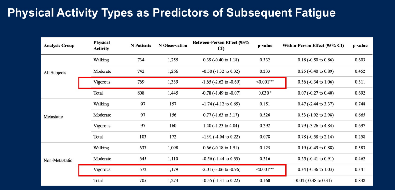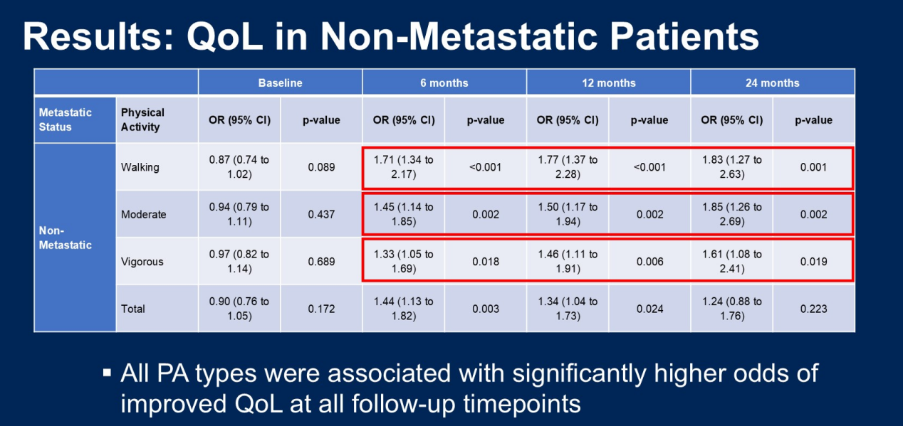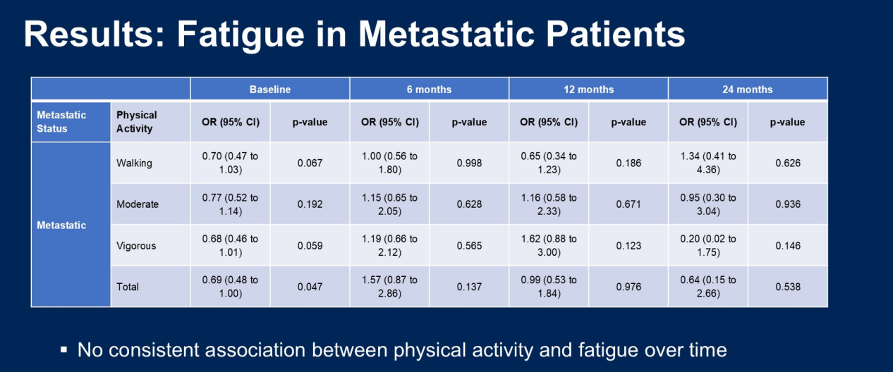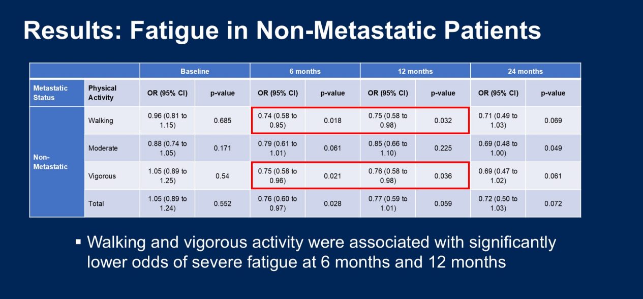 在非转移性患者中,步行和强力活动与6个月和12个月时严重疲劳的几率显著降低相关,且所有类型的体育活动都与随访期间生活质量显著改善的几率相关。