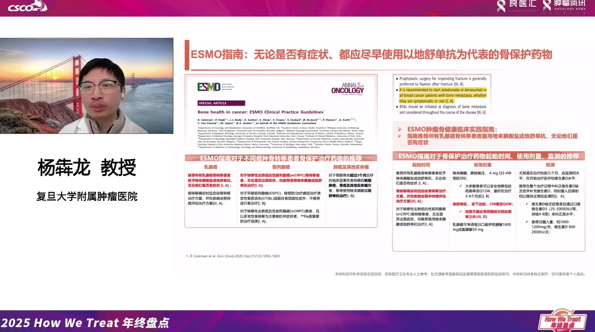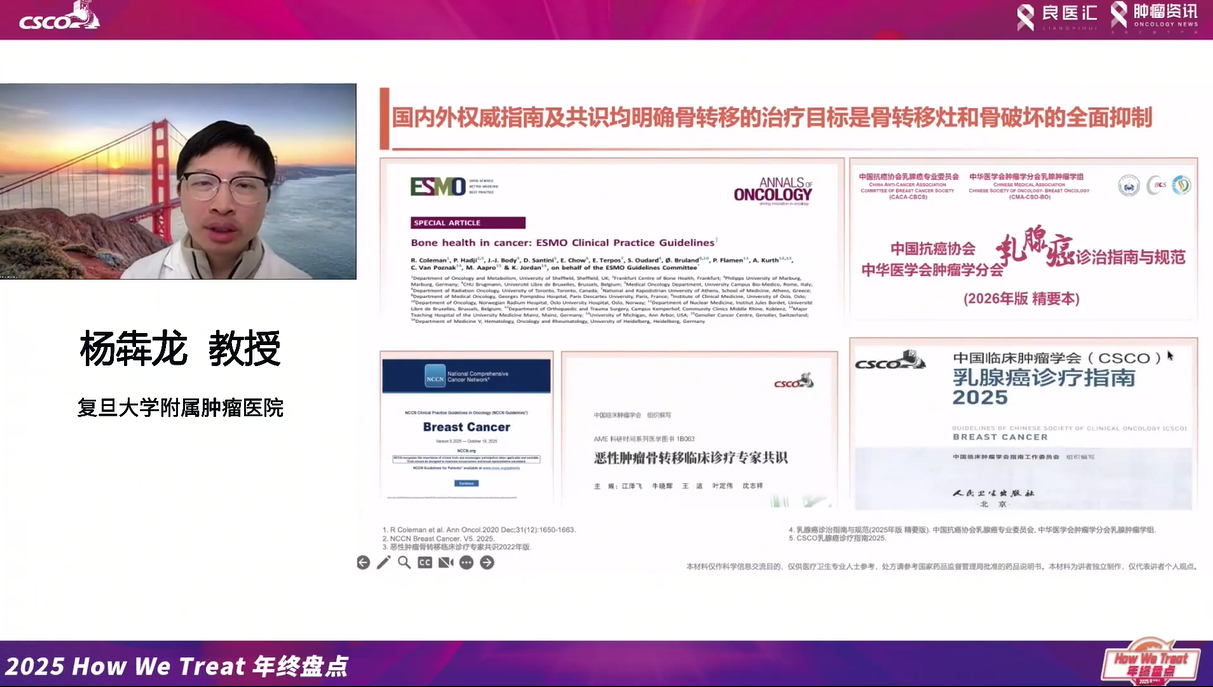 岁月不居,时节如流。1月17日,在这个承前启后的冬日,由中国临床肿瘤学会(CSCO)与良医汇联合主办的“2025 How We Treat年终盘点”在上海盛大召开。本次大会作为中国临床肿瘤领域标杆性的学术IP,不仅是一次对过去一年全球肿瘤诊疗进展的深度复盘,更是一场聚焦临床实践、探索未来方向的巅峰对话。在此次会议上,复旦大学附属肿瘤医院杨犇龙教授发表了题为《乳腺癌骨转移规范化治疗——全面骨保护,关注无症状》的学术报告,深入剖析了骨转移治疗的现况与挑战,并通过详实的循证医学证据,阐述了关注并干预“无症状骨转移”对于改善患者预后及提升系统治疗疗效的重要临床意义。【肿瘤资讯】特此梳理,以飨读者。