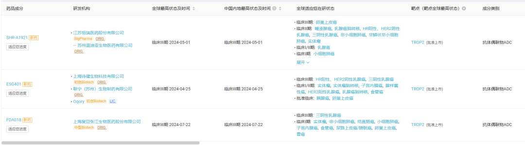 国产方面,除了已获批的 芦康沙妥珠单抗, 还有 3 款已进入临床 III 期,分别来自 复旦张江、恒瑞和诗健生物/联宁生物 。