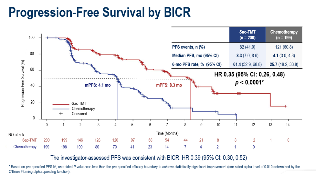 数据截至 2025 年 1 月 22 日,结果显示,芦康沙妥珠单抗组的 中位 PFS 较 ICC 组有显著延长 (8.3 个月对比 4.1 个月) ,且在不同 HER2 表达水平的患者中均观察到临床获益 (HER2 不表达患者 HR=0.39;HER2 低表达患者 HR=0.31) 。