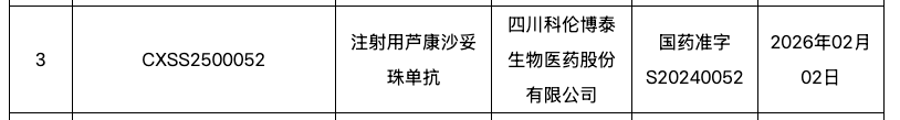 2 月 6 日,NMPA 官网显示,科伦博泰 TROP2 ADC 芦康沙妥珠单抗 ( sac-TMT) 获批一项新适应症, 用于治疗 既往接受过内分泌治疗且在晚期或转移性阶段接受过其他系统治疗的不可切除的局部晚期或转移性激素受体阳性 (HR+) 且人表皮生长因子受体 2 阴性 (HER2-) 乳腺癌 (BC) 成人患者 。此前该适应症已被 CDE 纳入优先审评审批程序。