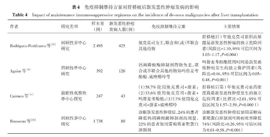 术后长期使用免疫抑制剂是维持移植物功能的关键,但同时也显著增加DNM的发病率。因此,如何平衡免疫排斥反应与DNM发病率,是肝移植受者长期管理的重要挑战。免疫抑制维持方案相关临床研究证据见表4。