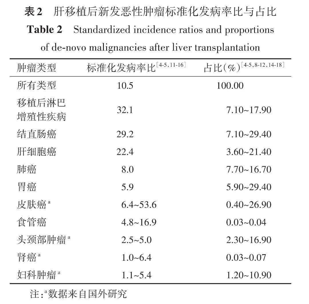 成人肝移植受者DNM的发病率显著高于普通人群,且长期随访数据显示其发病率随时间呈上升趋势 [1,4] 。各类DNM的标准化发病率比(standardized incidence ratio,SIR)及其在肝移植受者恶性肿瘤中的构成比见表2。受免疫抑制方案、地域环境因素及种族差异的影响,DNM的发病率存在显著的地域异质性。已有的研究结果显示:西方国家肝移植受者DNM的总体SIR约为11.6,我国的总体SIR约为10.5 [1,4-6,8-10,19-20] 。