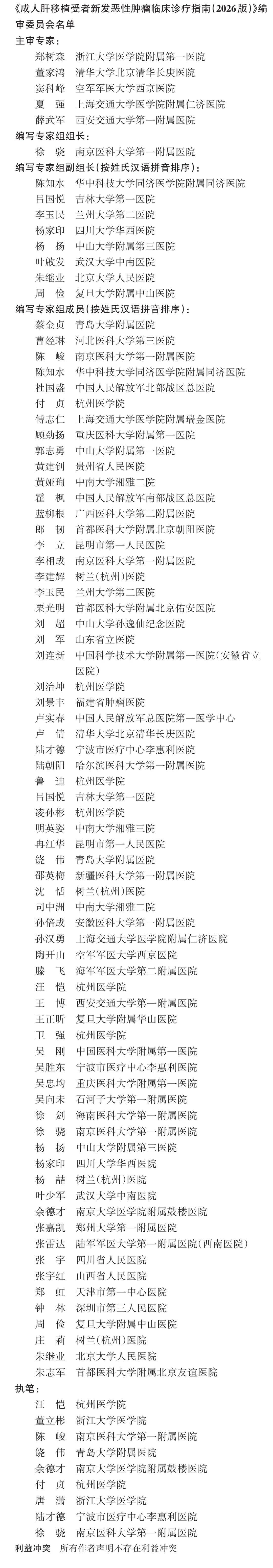 随着肝移植外科技术的进步及围手术期管理体系的完善,受者中远期生存率显著提高,新发恶性肿瘤( DNM )管理的重要性日益凸显。成人肝移植受者 DNM 的发病率约为普通人群的 10 倍,病死率为其 2~3 倍。 DNM 已成为肝移植后生存 >10 年受者最常见的死亡原因。为规范和优化成人肝移植受者 DNM 的诊疗和管理,中华医学会器官移植学分会和中国医师协会器官移植医师分会等组织专家研讨,结合最新循证医学依据和我国临床实践经验,充分借鉴国内外文献,制订《成人肝移植受者新发恶性 肿瘤临床诊疗指南( 2026 版)》(以下简称指南)。该指南系统阐述成人肝移植受者 DNM 的流行病学特征、危险因素、筛查策略及防治原则,提出相关推荐意见,旨在提升肝移植受者术后生命质量及长期生存率。