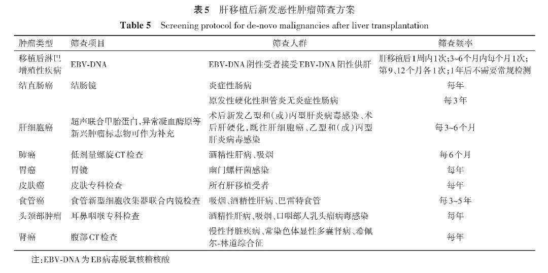 规范化的术后筛查是及时发现和早期干预DNM的关键环节。鉴于成人肝移植受者DNM发病率显著高于普通人群,尤其是存在致癌病原体感染、不良生活习惯等危险因素,建议实施更密集的筛查方案,有助于提高DNM的早期检出率,进而改善受者的长期生存率 [71] 。针对不同类型DNM的推荐筛查方案见表5。