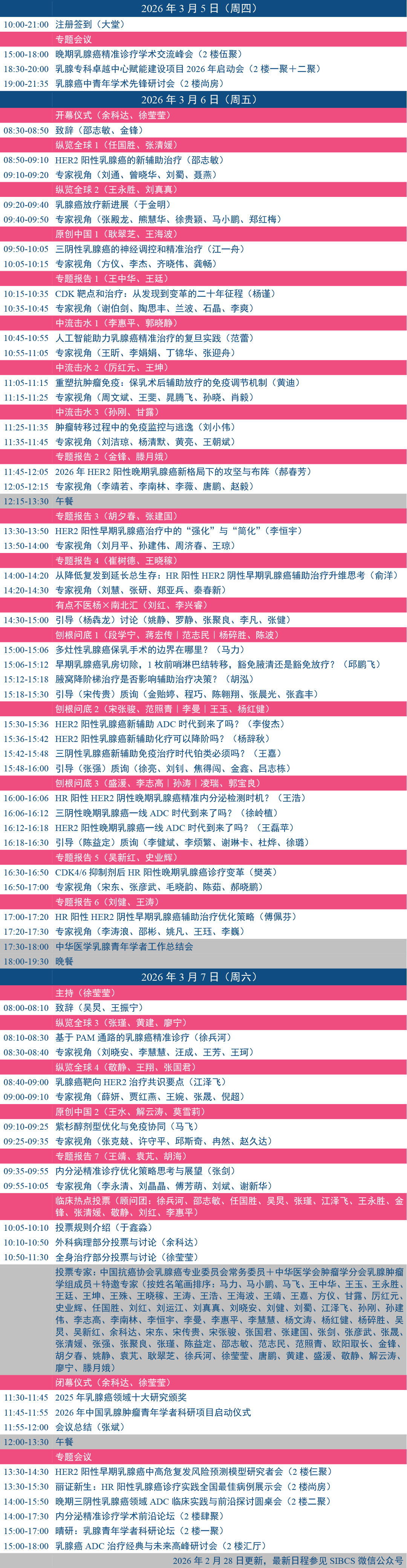 尊敬的各位专家同道,大家好!万物随春竞发,思想因聚而兴。在这生机勃发、希望升腾的早春时节,诚挚欢迎您莅临南北汇:第八届乳腺肿瘤论坛。本届论坛将于2026年3月5日至7日在沈阳举行,由中国抗癌协会乳腺癌专业委员会和上海市防癌抗癌事业发展基金会共同主办,中国医科大学附属第一医院、复旦大学附属肿瘤医院共同承办,特别鸣谢中华医学会肿瘤学分会乳腺肿瘤学组的支持。在此,我们谨代表论坛主办方,向长期以来引领中国乳腺肿瘤事业发展的各位前辈、携手前行的各位同道,致以最诚挚的问候与崇高的敬意!