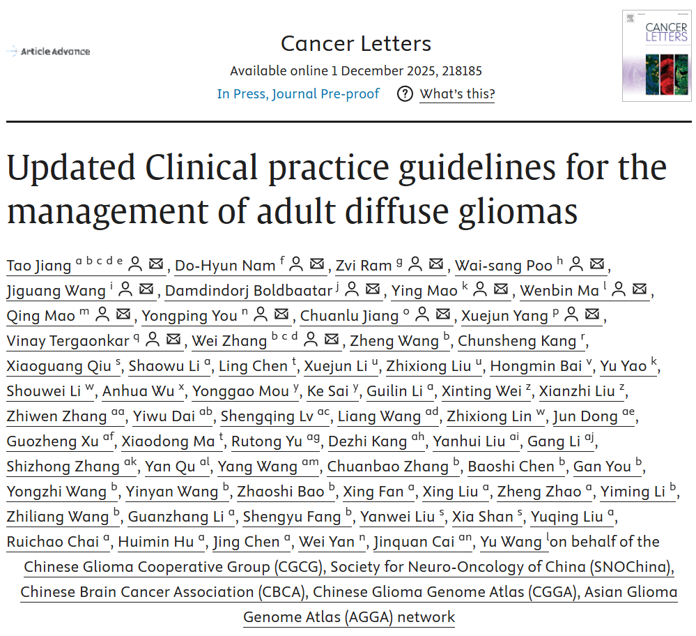 Jiang T, Nam DH, Ram Z, et al. Updated Clinical practice guidelines for the management of adult diffuse gliomas. Cancer Lett . Published online December 1, 2025. doi:10.1016/j.canlet.2025.218185