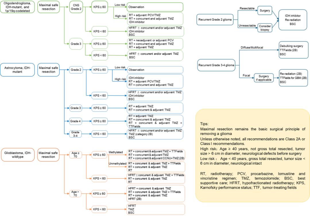 2级肿瘤 :若全切且患者状态良好(KPS≥60),可采取 “观察等待” 策略。对于未全切或存在其他高风险因素者,推荐 标准放疗联合辅助化疗 (PCV方案或TMZ)。 IDH抑制剂 对残留或复发的2级肿瘤显示出治疗潜力。 3级肿瘤 : 标准方案为放疗联合PCV化疗 (PCV疗效证据更充分)。放疗联合TMZ是备选方案。对于体能状态较差者(KPS<60),可采用 短程放疗±TMZ 。