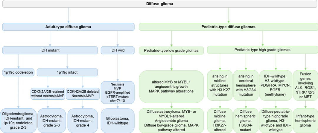 第三步:儿童型诊断特点(更复杂,核心看分子) 低级别 :主要特征为 MYB/MYBL1改变 或 MAPK通路基因 (如BRAF, FGFR1)改变。 高级别 :主要特征为 组蛋白H3突变 (如H3 K27突变见于中线,H3 G34突变见于大脑半球)。 对于 IDH与H3均为野生型 的高级别肿瘤(多见于婴幼儿/儿童/青年),需依据其他分子改变(如MET)和甲基化谱进一步分型。