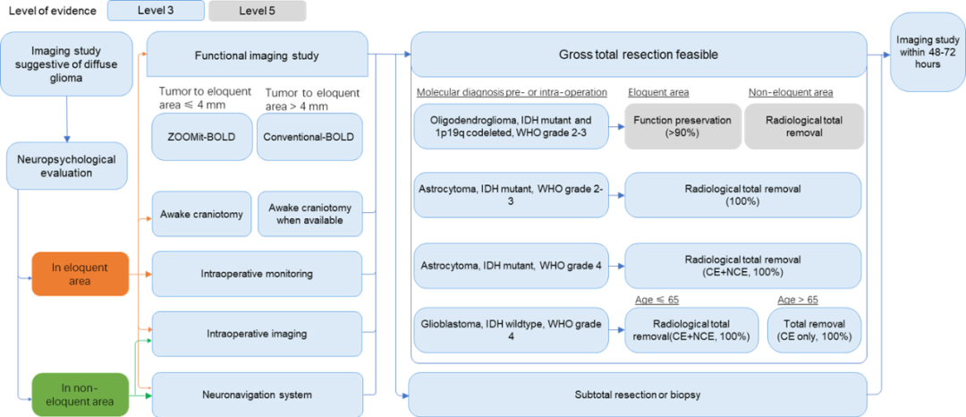 术前 :标准MRI评估。功能区肿瘤必须进行 神经心理及功能磁共振 评估,为手术“导航”。 术中 :运用 神经导航、术中MRI、5-ALA荧光 等辅助技术,以提升切除率、降低损伤。 术后 : 48-72小时内 行MRI评估切除范围。 分子指导 :切除策略因分型而异(如少突胶质细胞瘤需积极全切),但 底线是绝不能牺牲神经功能 。