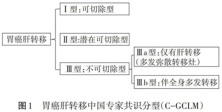 6.2.1 Ⅰ型:可切除型 Ⅰ型病人占胃癌肝转移总体病人的20%左右[8]。经MDT综合评估,胃原发灶和肝转移灶均可手术切除,可选择术前系统治疗(具体方案参照本共识“6.1 系统治疗原则”)或直接手术。