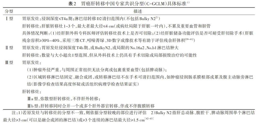 2019版共识首次提出并建立了全新的胃癌肝转移临床分型体系——胃癌肝转移中国专家共识分型(Chinese Consensus Classification for Gastric Cancer Liver Metastasis,C-GCLM),见图1。该分型系统的临床有效性与对预后的指导价值,已在后续开展的全国多中心RECORD研究中得到充分验证,并在2024版共识中沿用[12];本共识在此基础上进一步补充并更新了肝脏储备功能评估的具体实施方法及术中重要血管结构的保留原则。见表2[39-43]。