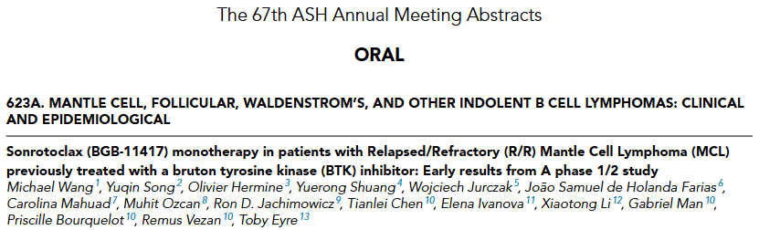 [1]Sonrotoclax (BGB-11417) monotherapy in patients with Relapsed/Refractory (R/R) Mantle Cell Lymphoma (MCL) previously treated with a bruton tyrosine kinase (BTK) inhibitor: Early results from A phase 1/2 study | Blood | American Society of Hematology.