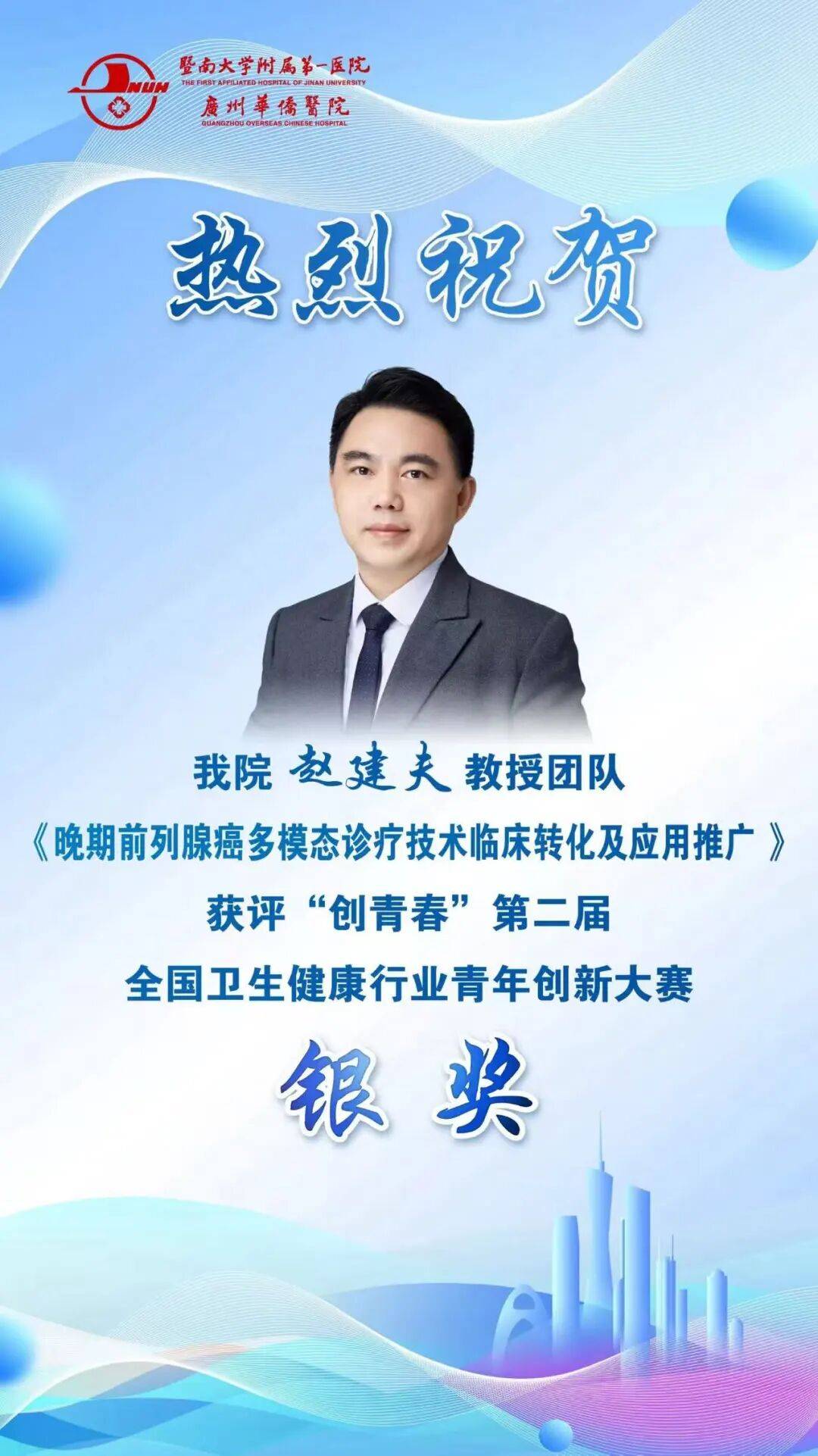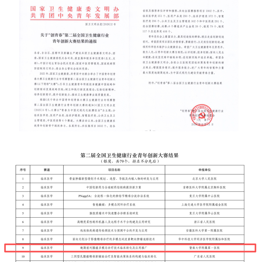 近日,在国家卫生健康委、共青团中央联合举办的中国青年创青春大赛卫生健康行业专项赛暨第二届全国卫生健康行业青年创新大赛(临床医学类)中,暨南大学附属第一医院副院长赵建夫教授团队主持的《晚期前列腺癌多模态诊疗技术临床转化及应用推广 》荣获银奖,为我院参加此项赛事的最好成绩