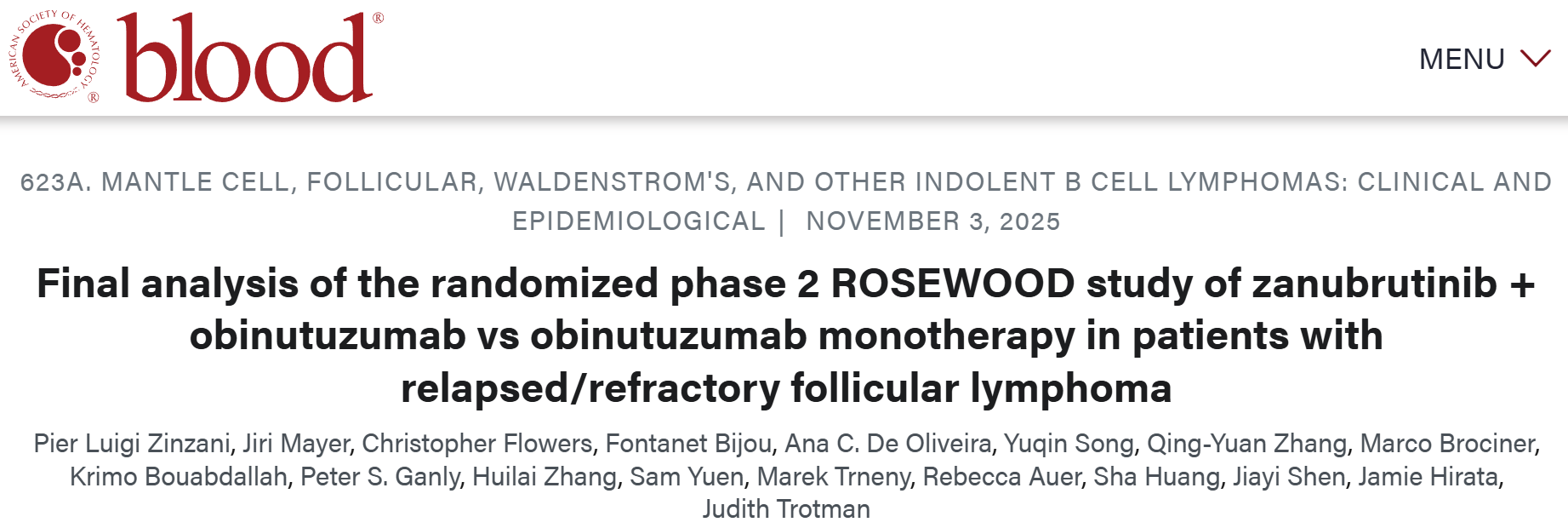 [1]Pier Luigi Zinzani, Jiri Mayer, et al. Final analysis of the randomized phase 2 ROSEWOOD study of zanubrutinib + obinutuzumab vs obinutuzumab monotherapy in patients with relapsed/refractory follicular lymphoma. Blood 2025; 146 (Supplement 1): 227.