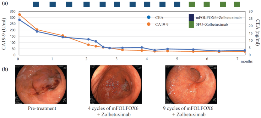 图5.(a)接受mFOLFOX6+佐妥昔单抗治疗期间的肿瘤标志物(CEA和CA 19-9)变化。(b)mFOLFOX6+佐妥昔单抗治疗前胃镜检查示Borrmann III型胃癌,mFOLFOX6+佐妥昔单抗治疗4个周期后肿瘤体积缩小,mFOLFOX6+佐妥昔单抗治疗9个周期后肿瘤消失