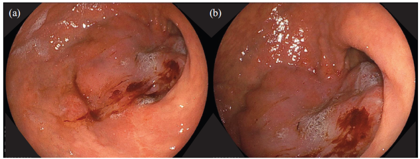 图1. 上消化道内镜检查(a,b)显示胃窦大弯侧Borrmann III型胃癌