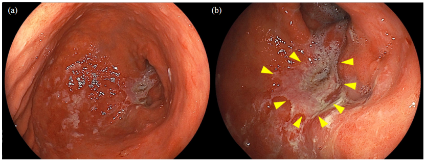 图3. 上消化道内镜检查显示原发病灶整体缩小,部分区域伴有溃疡形成(箭头)