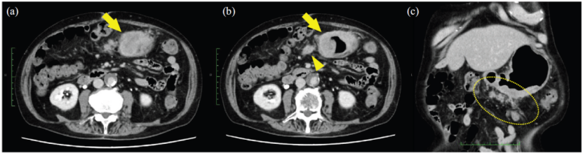 图2. 诊断时的腹部CT检查结果。腹部CT (a-c) 显示胃下部胃壁不均匀强化(箭头),胃周淋巴结转移(三角箭头),以及大网膜种植转移可能(虚线圈)