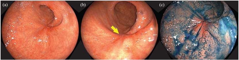 图4. 上消化道内镜检查显示原发病灶已经消失,并且可以观察到相对平滑的黏膜(箭头)。从瘢痕化的原发病灶处获得的活检标本显示仅存在炎性细胞,未发现肿瘤细胞