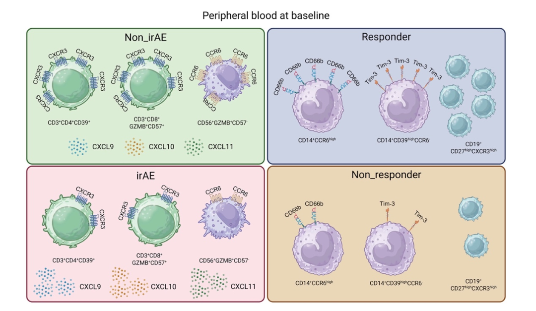 该研究在内部队列中针对接受免疫治疗患者的基线外周血单个核细胞(PBMC)41种蛋白表达进行了质谱流式分析。结果显示,与未发生irAE的患者比较,发生irAE患者的基线PBMC亚群趋化因子受体CXCR3和CCR6表达普遍降低;GZMB+CD57lowNK细胞亚群CCR6低表达可精准预测irAE和严重irAE;CXCR3配体CXCL9/CXCL10/CXCL11在外周血和受累器官中的表达水平呈反向增高。研究还发现,可预测irAE的PBMC标志物CXCR3和CCR6不能同步预测免疫治疗的疗效。这些发现在多个独立irAE队列、免疫相关的肠炎、免疫相关的肺炎患者中得到验证。本研究首次揭示了外周血CXCR3和CCR6低表达是发生irAE的独立风险因素,为临床早期识别高危irAE提供了可靠的、无创性预测标志物,同时证实了免疫治疗毒性和疗效预测标志物的分离现象,描绘了外周血和受累器官免疫细胞异质性图景,也为未来探索趋化因子信号参与irAE发生机制及干预措施提供了新思路。