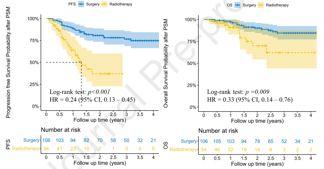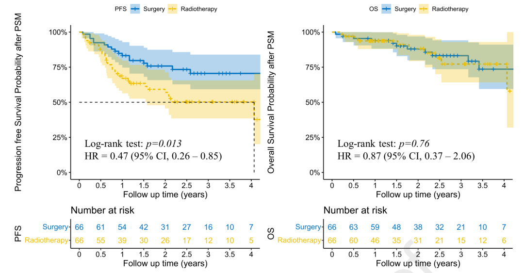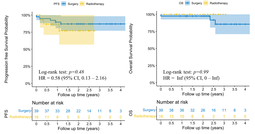 最终,在这部分患者中,有39名选择手术,16名选择放疗。分析显示,无论是无进展生存时间还是总生存时间,两组患者均无明显差异。