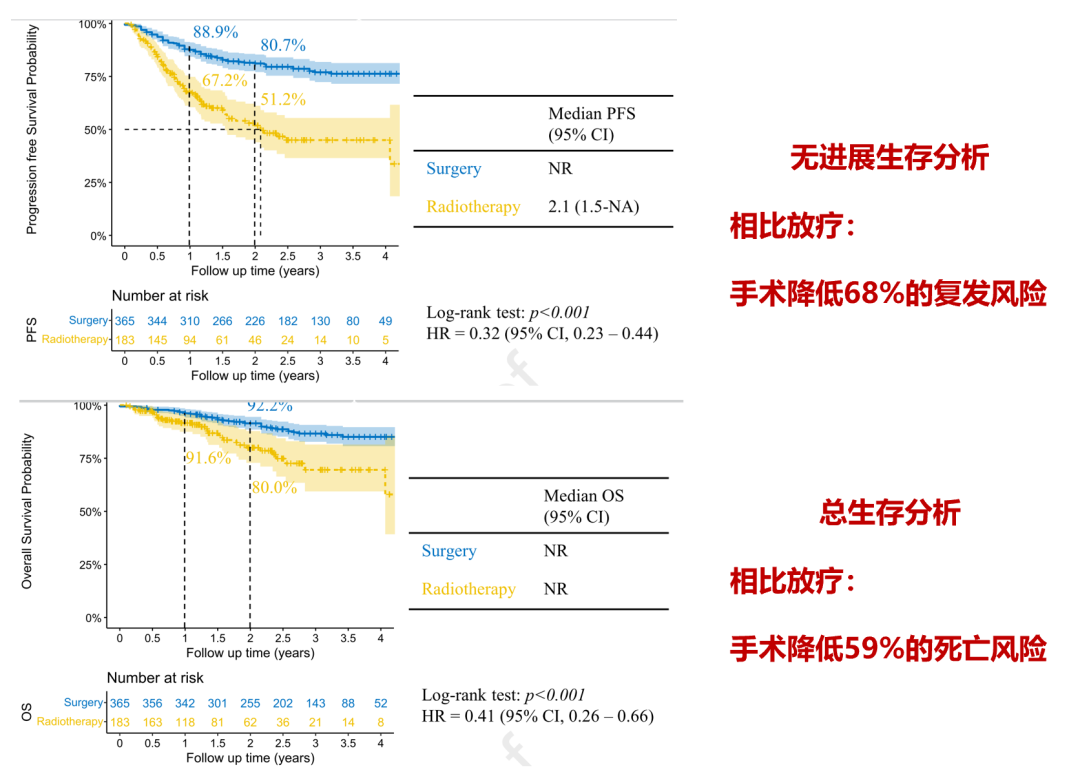 分析结果显示,手术组带来了显著更好的治疗效果,表现为降低了68%的复发风险以及59%的死亡风险。