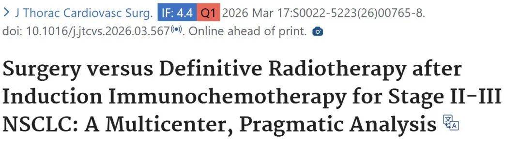 这是2026年3月发表在《胸心血管外科杂志》上的一项多中心真实世界临床研究,探讨的是在局部进展的II-III期患者肺癌中,在新辅助化疗联合免疫治疗有效的前提下,开展手术和放疗的对比研究。