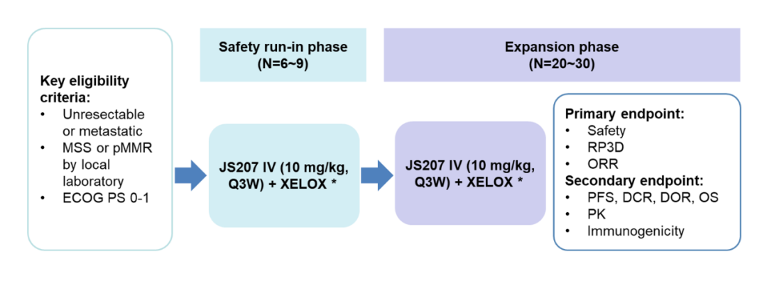 该研究(NCT06885385)是一项开放、单臂、II期临床研究,计划纳入既往未接受过任何系统性抗肿瘤治疗,或在完成新辅助/辅助治疗结束至少12个月后出现疾病复发或进展的MSS/pMMR型mCRC患者,接受JS207(10 mg/kg)联合XELOX(奥沙利铂 130mg/m 2 , d1+卡培他滨 1000mg/m 2 , BID, d1-14)治疗,每3周给药一次,直至疾病进展或出现不可耐受的毒性。JS207治疗持续至多2年,奥沙利铂最多使用6~8个周期,之后为卡培他滨维持治疗。研究包括安全导入期和扩展期两个阶段。主要终点包括安全性、Ⅲ期推荐剂量(RP3D)和ORR。次要终点包括PFS、疾病控制率(DCR)、缓解持续时间(DOR)和总生存期(OS)等。