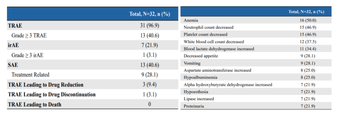 • 总体耐受性良好 :安全导入期未观察到剂量限制性毒性。≥3级治疗相关不良事件(TRAEs)发生率为40.6%,仅1例(3.1%)患者发生了≥3级免疫相关不良事件(irAEs),未发生导致死亡的TRAEs(表2)。