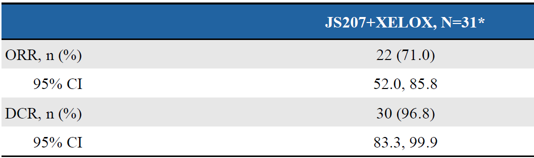 该研究由北京大学肿瘤医院的沈琳教授、上海市东方医院的高勇教授共同牵头开展。结果显示, JS207 联合化疗一线治疗 MSS /pMMR mCRC 展现出 积极疗效信号, 客观缓解率( ORR )达 71.0% ;由于随访时间尚短,中位无进展生存期(PFS)尚未成熟;研究整体耐受性良好 。该研究结果为抗 PD-1/VEGF 双抗在晚期结直肠癌一线治疗中的进一步临床开发提供了初步证据,并提示其在该人群中具有良好的临床应用前景。